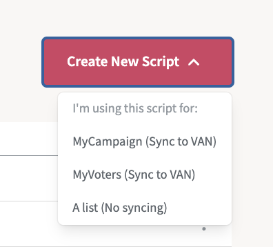Screenshot of the 'Create New Script" drop-down for selecting MyCampaign or MyVoters
