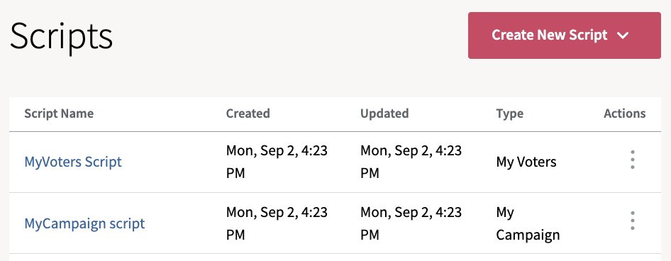 From the Scripts Index page, you can select which VAN committee each script is connected to. To begin creating a VAN integrated script, select MyVoters or MyCampaign from the Create New Script drop-down.